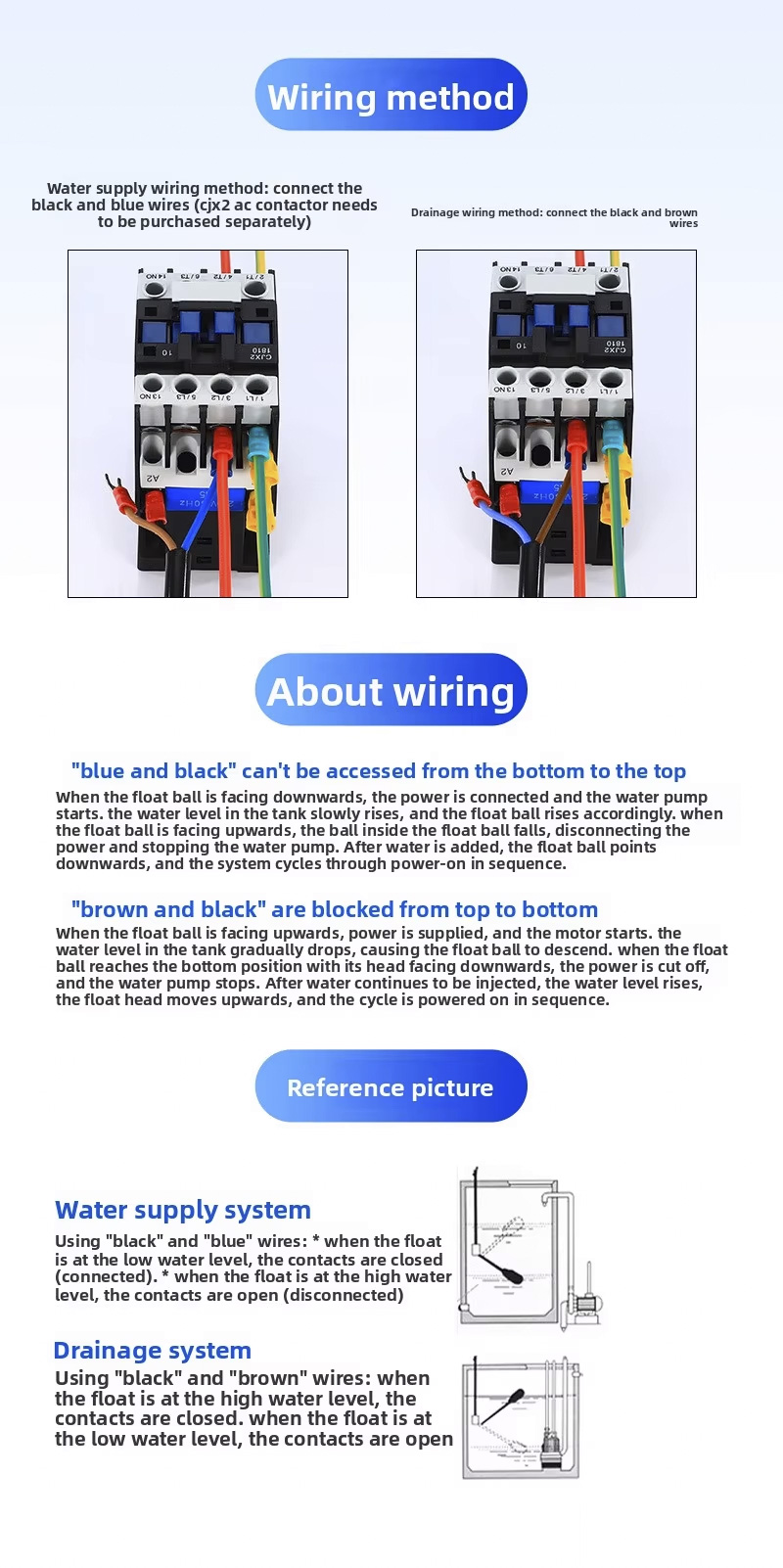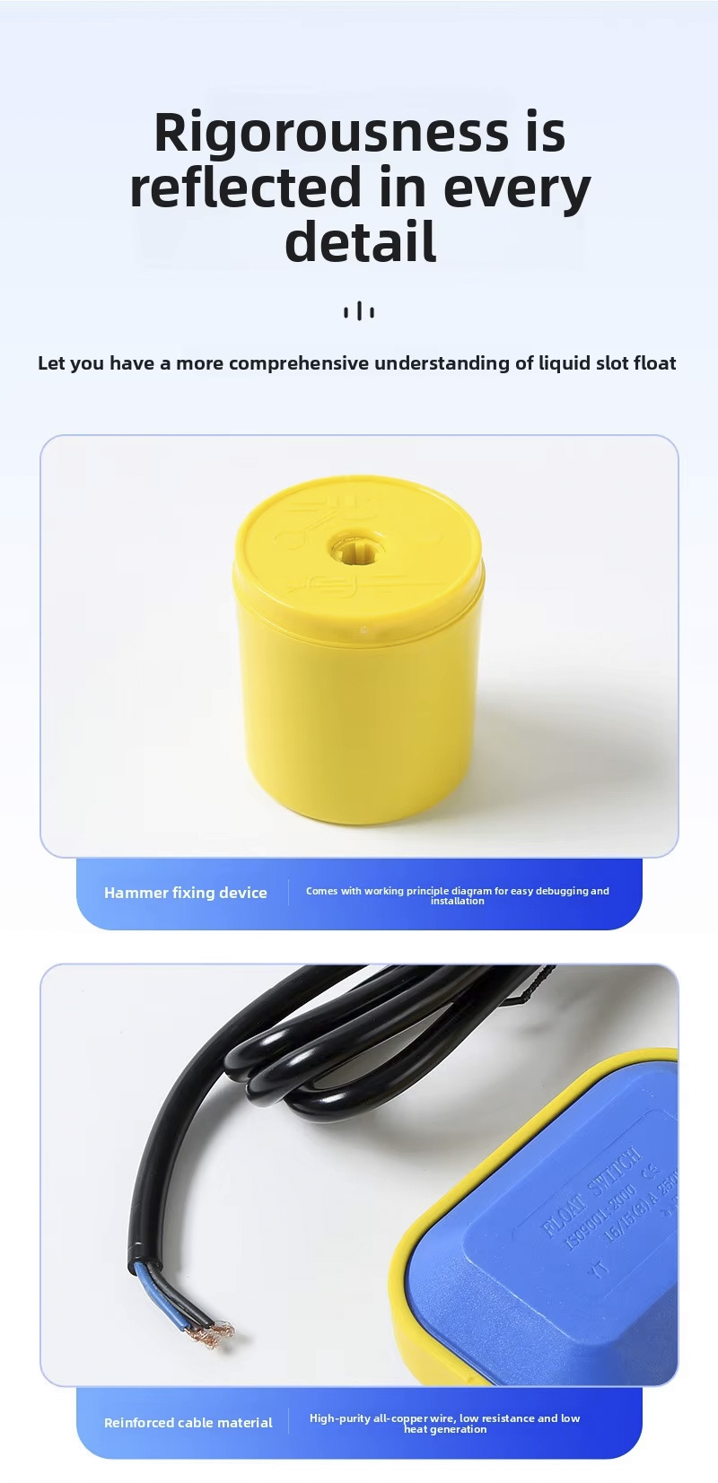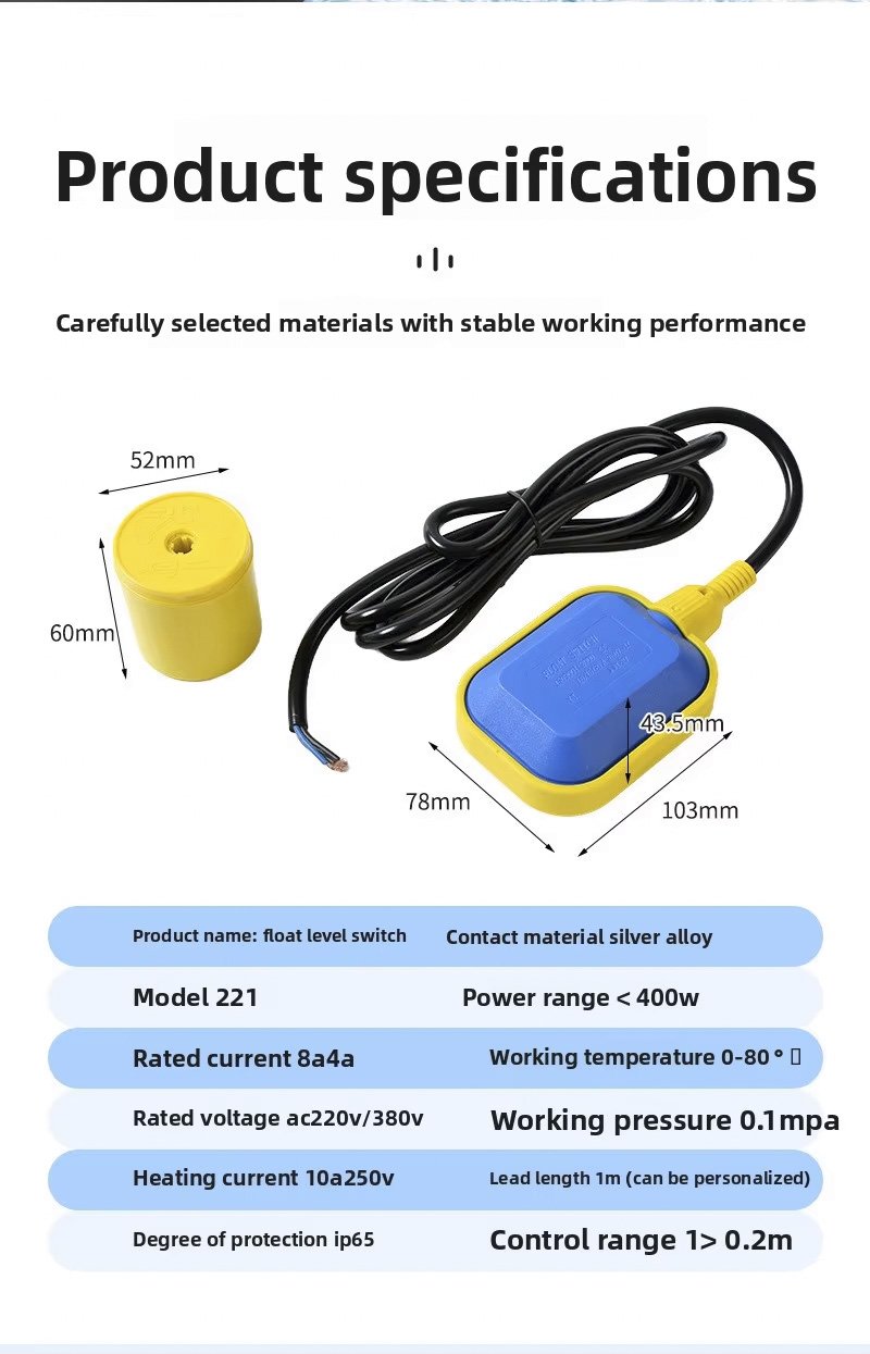 Công tắc phao này có thiết kế hình tròn lớn với cấp bảo vệ 2m,3m,5m,10m,IP68 và hoạt động ở nhiệt độ từ 0oC đến 80oC, hỗ trợ dải điện áp rộng từ 110V đến 220V và có áp suất làm việc mạnh mẽ ±0,5Mpa. Sản phẩm có thể tùy chỉnh với khắc laser, logo dập nổi hoặc dịch vụ OEM/ODM, đảm bảo khả năng thích ứng cho các ứng dụng đa dạng.